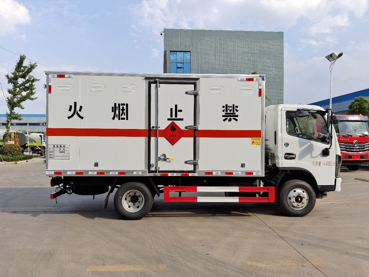 | 貨箱配置 | 廂體為雙層金屬骨架結構,外板采用冷軋鋼板,中間填充阻燃泡沫,內飾為鋁板。底板為平板上鋪防靜電膠皮。廂內兩側加裝固定貨物臥環,門框帶防盜報警器,頂部帶煙霧報警器,廂體右側選裝側門,隨車配2個滅火器,危險標志牌,防火帽,危險品三角頂燈。(也可用瓦楞板) | ||